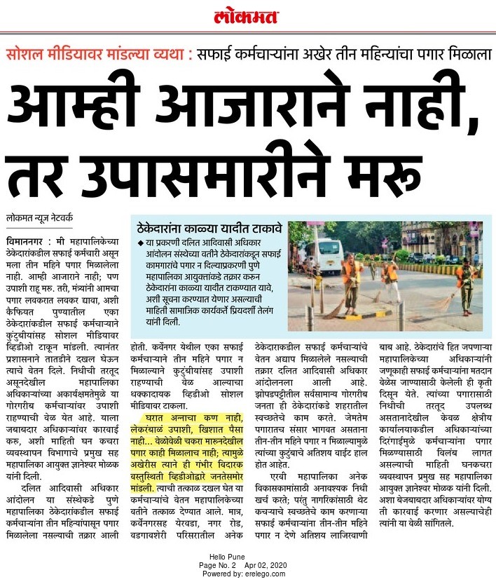 During the Covid 19 pandemic, Sanitation workers faced lots of difficulties while working. Manuski team did case study on Sanitation workers and also encouraged fellows to work with them. To resolve various issues faced by them Manuski had a dialogue over phone with Dy Commissioner Pune Municipal Corporation (PMC) for payments of Contract Conservancy worker during the time of Pandemic, and providing safety equipment’s for all workers. As there was no progress on it, the issue was raised in media dated 31st Mar 2020 and then payments were released.