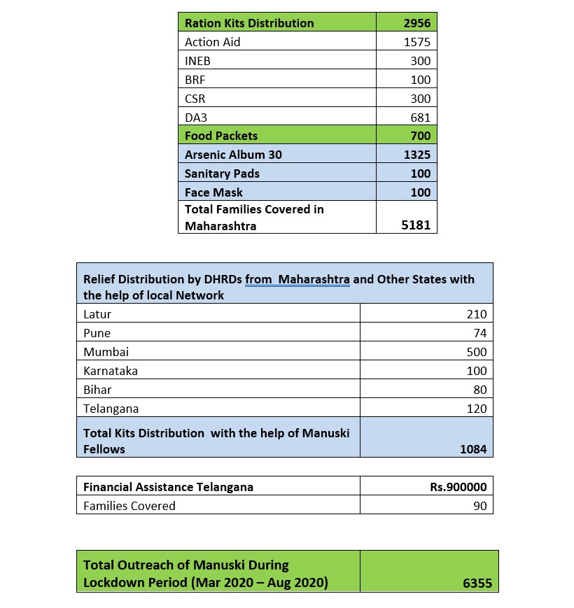 Manuski distributed ration kits with the help of local DHRDs along with other parts of Pune and Pimpri –Chindwad and also covered rural areas Alandi Devachi, Shirur and Daund and Latur,etc. Along with Maharashtra, Mansuki also distributed ration kits at Karnataka, Bihar and Telangana with the help of Local DHRDs. Altogether Manuski reached 6355 families during lockdown period, which includes 5965 families in Maharashtra 100 families from Karnataka, 80 from Bihar and 120 families from Telangana State.