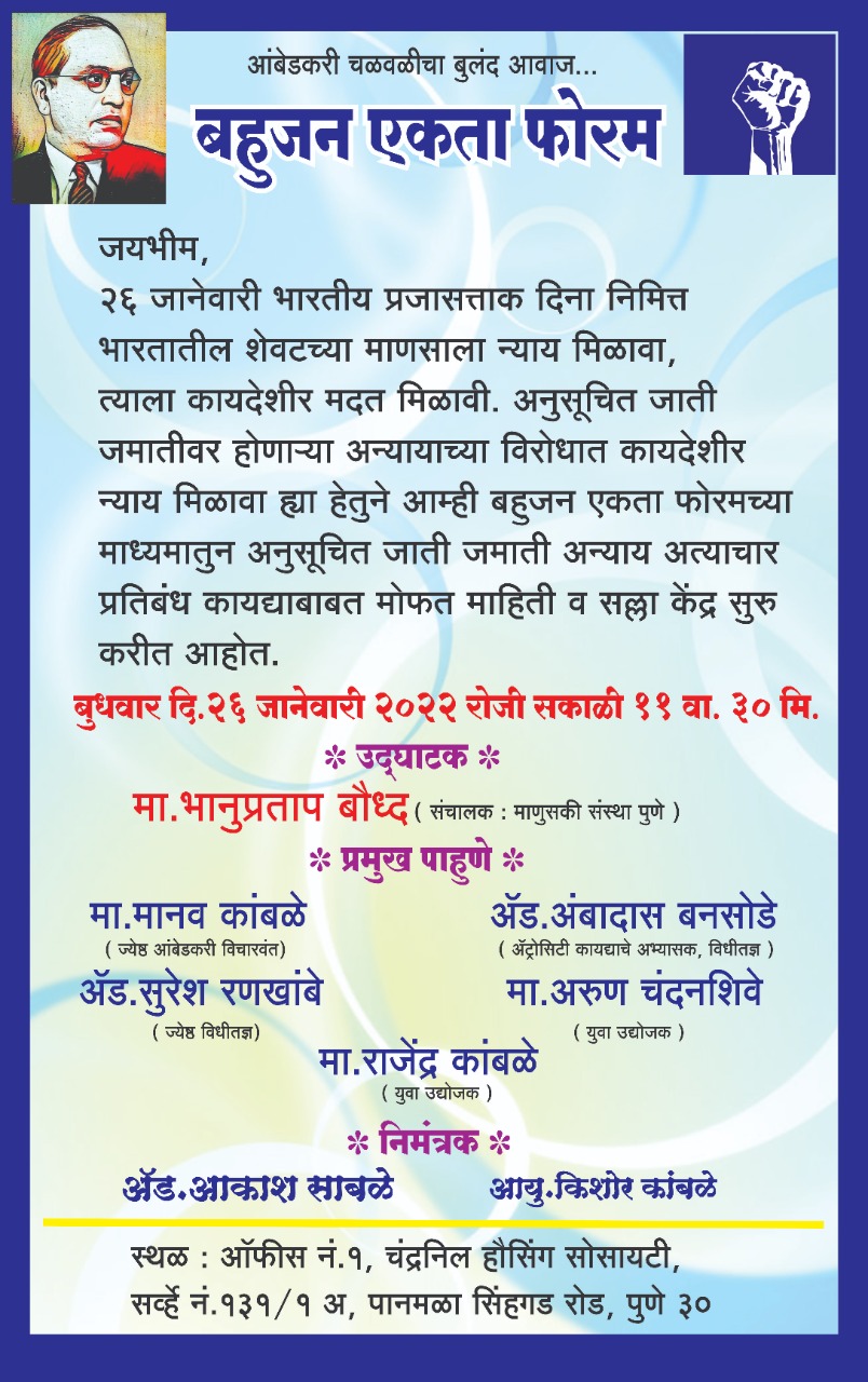The (free) Legal Aid and Legal Counselling Centre was inaugurated on 26th January 2022 by the Director of Manuski. This centre aims to provide support to the survivors of caste atrocities without any cost. It is initiated by Bahujana Ekta Forum and is being run by Adv Akash Sabale, the co-director of CARVA. The centre will operate from 4 pm to 8 pm every day.