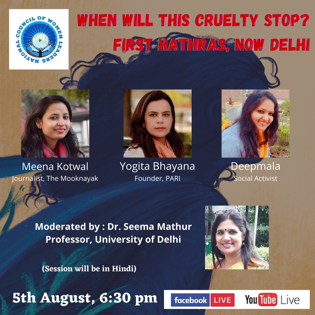 Join us for a live discussion! We will go live with Meena Kotwal (Journalist, The Mooknayak), Yogita Bhayana (Founder, People Against Rape In India) and Deepmala (Social Activist, founding member NCWL). The session will be moderated by Dr Seema Mathur (Activist, Asst Professor, University of Delhi; founding member NCWL)